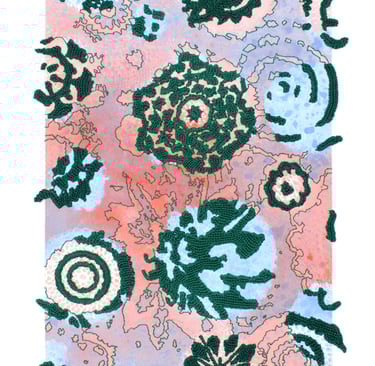 KATIE SCHUTTE: When I began this series, I planned for all of them to start with spraying paint through doilies and treating the paper as a fabric by stitching and crocheting on it. Beyond those initial parameters, I challenged myself to let the rest develop organically. Much of the process of making these pieces was left to chance. Even when I planned which colors to use, I give up some control of the final result as I never know how much the paint will bleed or absorb into the paper. I chose the fiber color and how it would be stitched and crocheted after the painting was completed, so I was always reacting to the work and making aesthetic choices as I went. Overall, color, form, and composition in my work tends evolve from the work as I react and make mostly intuitive decisions in response it.