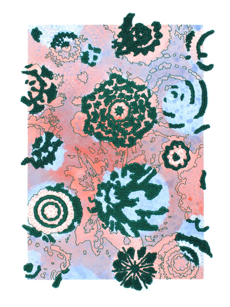 Katie Schutte, Memory XVII, 2025, 24 in × 18 in, acrylic with stitched and crocheted fiber on paper.