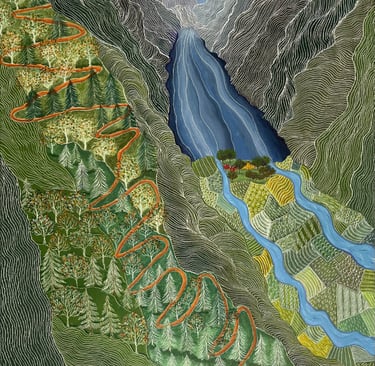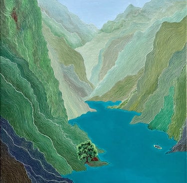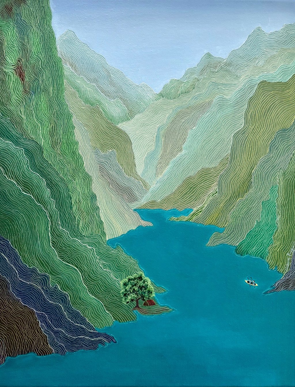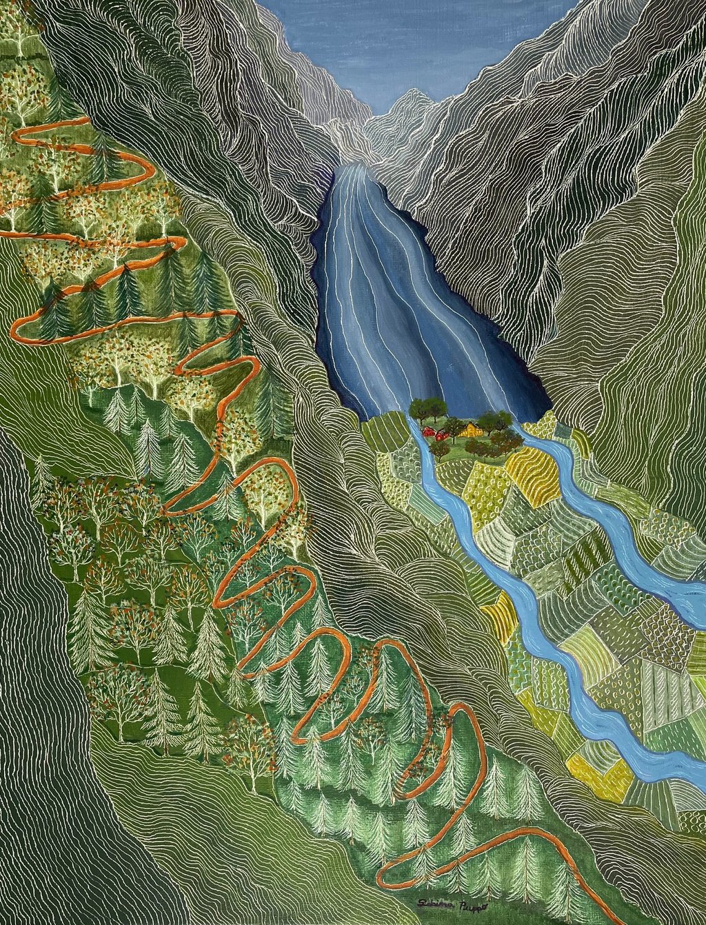 "I take my role as an artist with lightness and delight. I experience boundless joy and fulfillment when working in my studio. Whenever I feel awe, I try to find a way to capture it in my art. My approach to painting and drawing on the oil allows me to create a language and rhythm filled with textured colors, playful lines, moving patterns, and curious inhabitants set in majestic landscapes. My paintings celebrate connections between the natural world and human relationships full of love, mundane yet heartwarming activities, and encouragement to slowdown, tread lightly, and live in the present moment. I prefer to be a bearer of good news in an often-confusing world and tap the immense power of color and images to restore and lift the spirit. Through my art, engender tranquility, delight in Nature, and appreciation for being alive."
