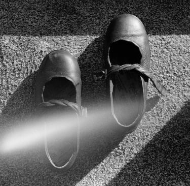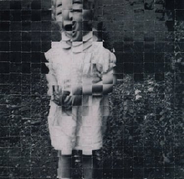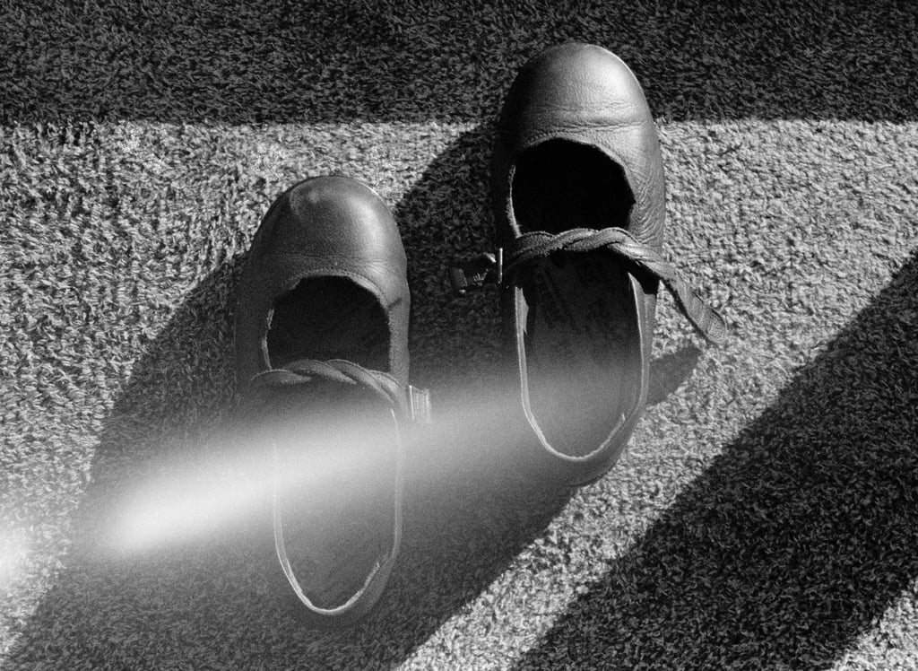 Sally Smoker, Her Small Beginning, 2025, 15.75 in x 11.8 in, handwoven collage of archival photographs; Sally Smoker, Empty Footsteps, 11.8 in x 15.75 in, black and white 35mm film photograph. Images courtesy of the artist.
